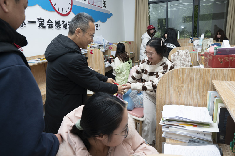 2025年全国硕士研究生招生考试在即,为关心关怀备考学子,提振士气,增强信心,12月13日上午,学院院长沈红卫、党委副书记石旭明与相关职能部门、分院负责人、辅导员深入考研自习室,看望慰问2025届考研学子,为紧张备考的学子们送上祝福。