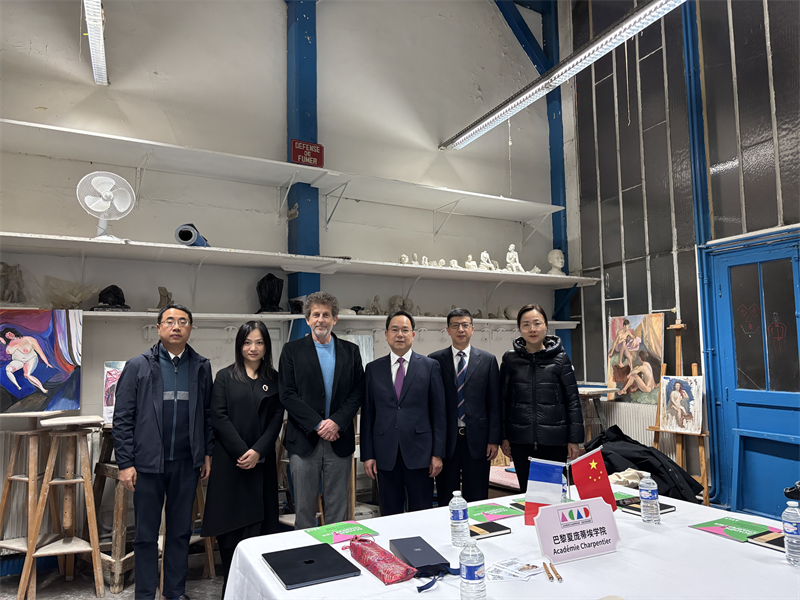在法国巴黎夏庞蒂埃学院,梁瑜与巴黎夏庞蒂埃学院塞尔日•扎格丹尼斯基Serve ZAGDANSKI)及相关负责人进行座谈。双方就艺术领域尤其是室内空间和建筑设计人才培养交换想法与见解。代表团一行走访参观大茅屋画室创作工作室、建筑室内设计工作室等,并诚挚邀请塞尔日•扎格丹尼斯基先生等来院考察交流,推进双方深层次合作交流。