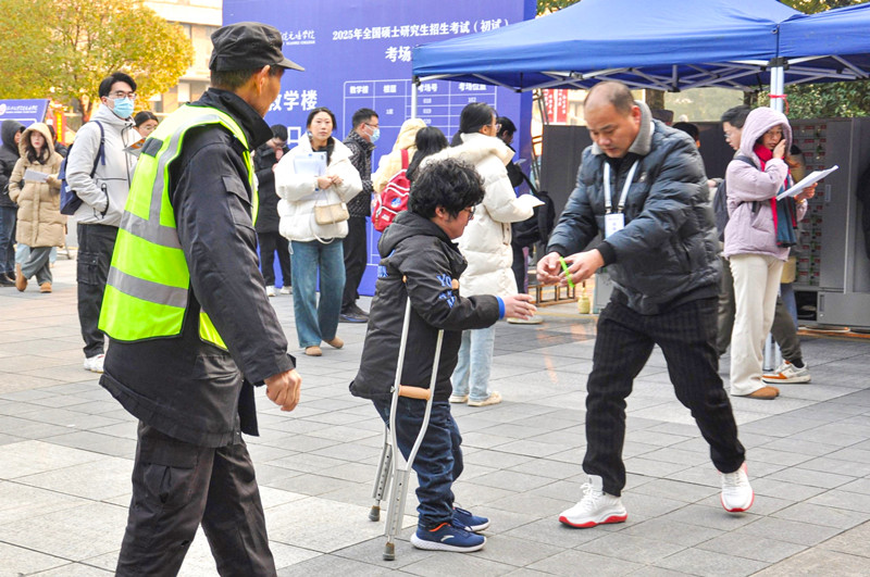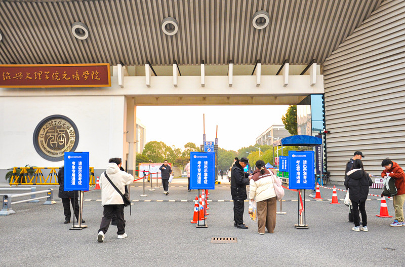 为期两天的“赶考”中,一场特殊的陪考在校园内接力续航。一位来自嵊州患有腿疾行动不便的考生,已连续两年来到学院考点参加研考校门,便引起场工作人员和志愿者的关注为确保该考生顺利安心应考,考点工作人员在保证考场秩序、满足考试要求的前提下,一路温暖相伴、爱心助力,自发为这位考生保驾护航。我们安排了志愿者‘一对一’服务,妥善为该考生提供合理便利与必要帮助,包括提供免费午餐,落实临时用餐点、休息点,安排专人开车接送、考场外全程陪同等,全力保障考生安心赴考。考试考务组负责人介绍。