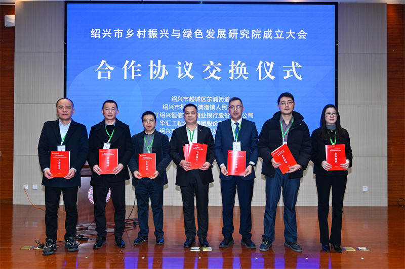 建筑工程分院与合作单位越城区东浦街道、柯桥区漓渚镇人民政府、浙江绍兴恒信农银行股份有限公司、华汇工程设计集团股份有限公司、绍兴市越城区农创客发展联合会、越城区鉴湖街道坡塘村股份经济合作社交换合作协议