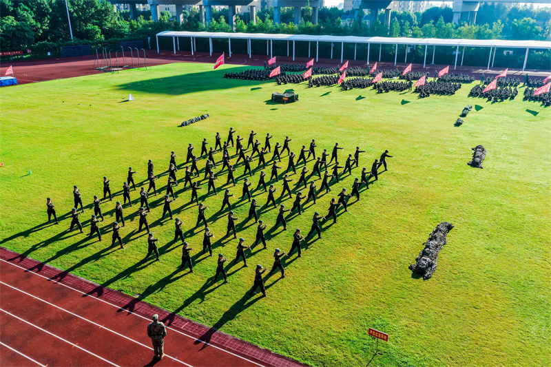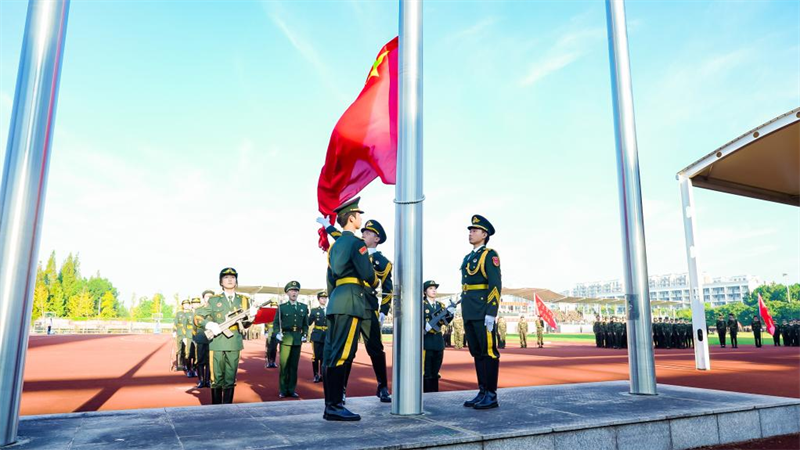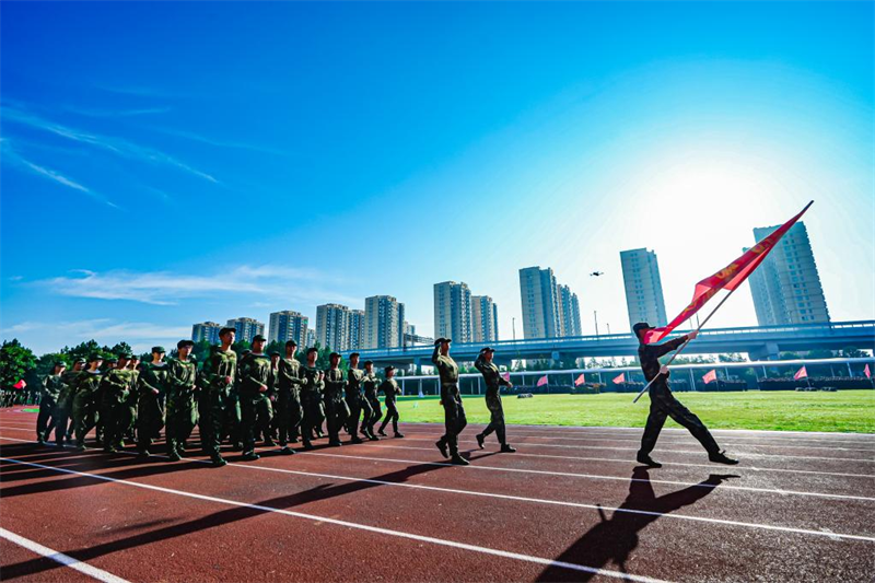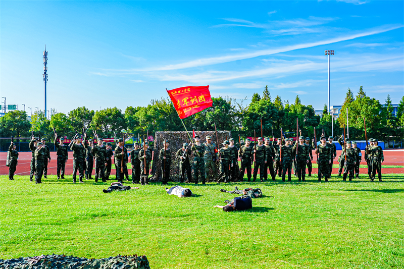 上午7时,伴随着中华人民共和国国歌《义勇军进行曲》的激昂旋律,五星红旗冉冉升起,全体人员肃立,行注目礼、高唱国歌。升旗仪式后,《分列式进行曲》奏响,军训团护旗队昂首擎旗、步伐坚定率先入场,各连队方阵紧随其后,迈着铿锵正步,依次通过主席台接受检阅,新生们以挺拔身姿、饱满精神与昂扬斗志,充分展现数日以来的军训成果与新时代青年的青春风貌。随后,军事技能展示环节有序开展,赢得现场师生阵阵掌声。