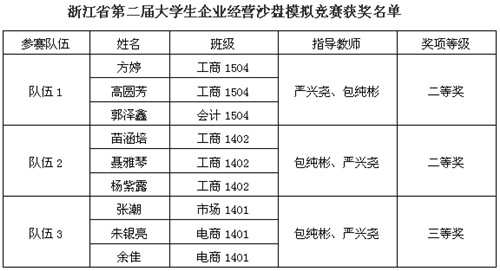 10月20日至22日,浙江省第二届大学生企业经营沙盘模拟赛在嘉兴学院举行,经济管理分院经过选拔,派出了三支代表队参赛,最终获得二等奖2项,三等奖1项,突破了2016年浙江省第一届大学生企业经营沙盘模拟赛取得的成绩。