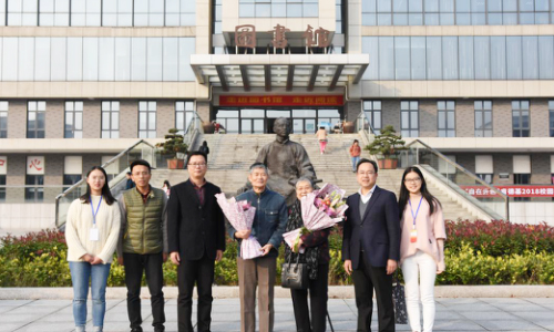 党委书记梁瑜、组织宣传部负责人一行与何亮夫妇在蔡元培铜像前合影