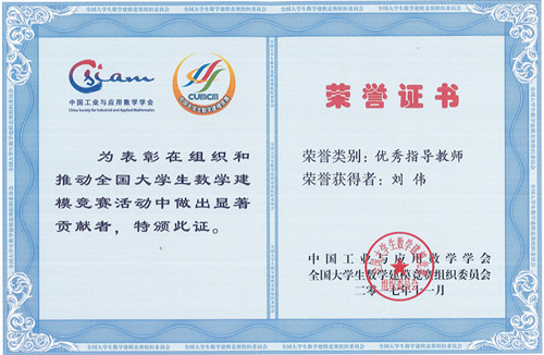 刘伟老师作为太阳数学建模竞赛基地负责教师,一直参与全国大学生数学建模竞赛的组织、培训、指导工作。自2005年起,指导学生荣获美国大学生数学竞赛一等奖3项、二等奖14项;全国大学生数学建模竞赛全国一等奖3项、全国二等奖7项,2011年曾获浙江省“优秀指导教师”称号。