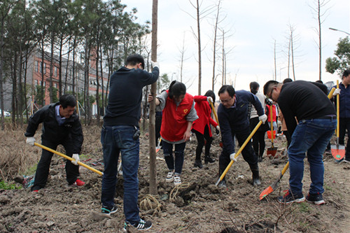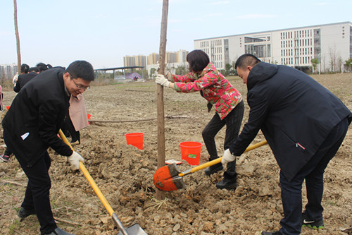 在植树过程中,大家三五人一组分工协作,撸起袖子干劲十足。铲土、挖坑、扶树、填土浇水,每道工序有条不紊,呈现出一片热火朝天的劳动景象。不到1小时,70棵落羽杉覆盖荒地迎风挺立,成为校园内的一道亮丽的风景线。“开展植树活动意义重大不仅唤醒了大家对植树节这一传统节日的认识,增强了大家的环保和生态意识,同时也为美丽校园增添新绿贡献了自身力量。”参加活动的师生纷纷表示。