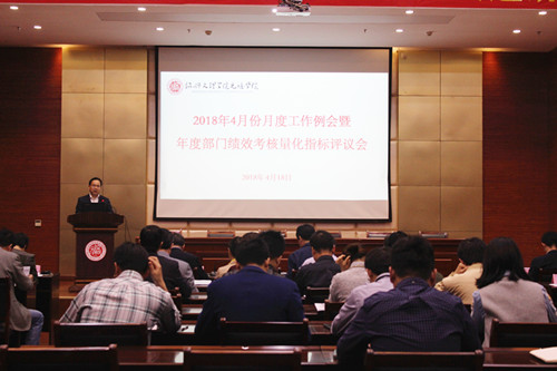 4月18日下午,学院召开4月份月度工作例会暨2018年度部门绩效考核量化指标评议会。学院领导班子全体成员、全体中层干部参加会议。党委书记梁瑜主持会议。