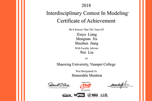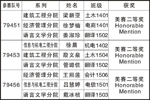 在学院和领导的关心和大力支持下,公共基础分院数学教研部组建了由刘伟老师牵头,辛晓东、章月红、蒋望东、邱晓龙、龚玮荣、姜东、杜磊等8名教师组成参与的多学科交叉指导教师队伍。数学教研部从去年3月份开始,就着手开展竞赛学生选拔、组织、宣传和培训指导等各项工作,通过周末、暑假培训,专家讲座、实战演练等方式,最终确认由来自经济管理分院、建筑工程分院、信息与机电工程分院、语言文学分院组成的3支队伍共9名学生参赛。在第二轮强化训练中,学生的思辨能力、应用所学知识的能力、语言表达及写作能力强有力塑造,跨学科创新能力效提升。2月11日至14日,3支参赛队伍通过4天4夜的查阅外文资料、建立模型、求解模型、解释模型结果,完成每组20多页英文论文的撰写并获得国际奖项,展现了相当的科研能力。这也将为参赛学生接下来申请国外学校和研究生复试助力。
