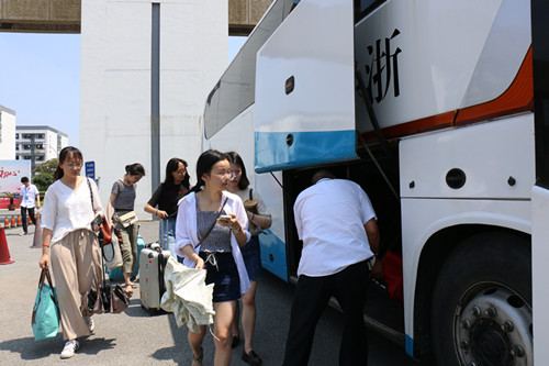 此次送站服务为期一天,共安排3辆大巴车,分别从南门至绍兴北站、北门至绍兴北站、西门至绍兴火车站-绍兴客运中心,每2小时一趟,全天共发出31趟次校车。各出发站志愿者们积极维持秩序,公寓南广场的志愿者们帮助毕业生们打包、搬运行李。自愿担任志愿者的学弟学妹们,为学长、学姐们送别在大学的最后一程。