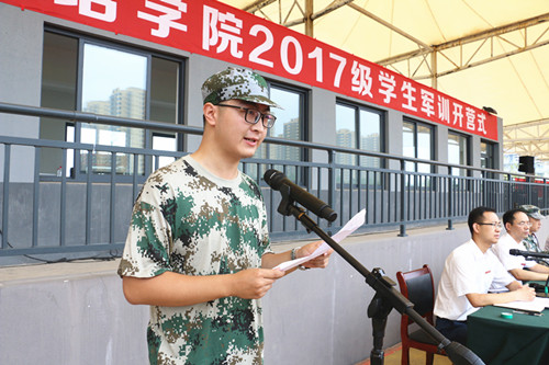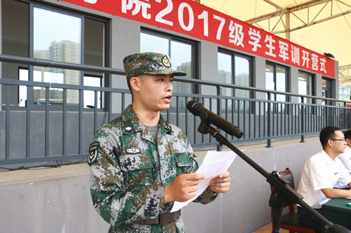 军训团教官代表王兴军同志发言。他表示将服从命令、听从指挥、严格训练、文明带兵、以身作则、团结协作,确保此次军训任务顺利完成。学生代表汉语言1701班王嘉楠同学表示,将坚决履行服从命令、遵守纪律、虚心学习和团结互助的承诺,以优异的成绩展现新一代大学生的良好精神风貌。