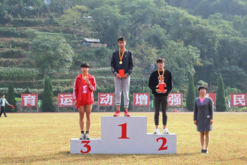 运动员代表(左四)上台领取田径项目总分第一名奖牌