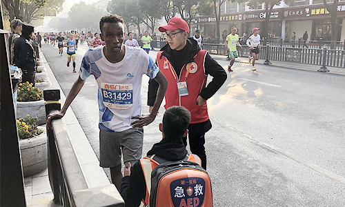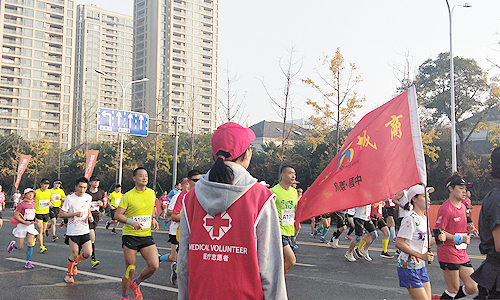 上午9点10分左右,在中兴路段位置,一位来自杭州的选手,呼吸急促,步行艰难,面色苍白。志愿者葛美龄见此状况,马上打开护拦上前询问,并将选手扶到一旁休息,第一时间找来了医疗救护队进行诊治。事后了解到这位选手第一次参加马拉松,为了突破自己,速跑几公里后心脏便难以承受,在志愿者和医护人员的悉心照料下,最终情况好转继续上路坚持奔跑。