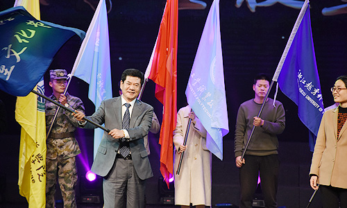 叶访春院长与下一届承办学院代表——绍兴职业技术学院举行会旗交接仪式。晚会在歌舞表演《青春不打烊》中圆满落下帷幕。