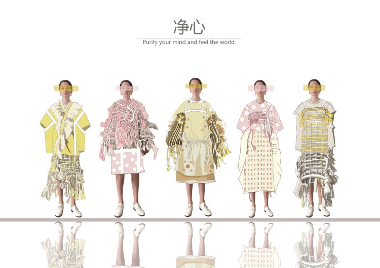 “净心”的设计来源于西藏当地的文化,西藏的手工编织以及五彩经幡,通过最朴实简单的原材料创造出精美的物件。本次的设计通过棉、麻绳与欧根纱的结合,感受西藏当地对神灵的祈求所在,寄托着美好的愿望,从而让人的心灵得到净化和洗涤。西藏文化成为了人们渴望获得心灵、肉体与感官洗涤的“世外桃源”。