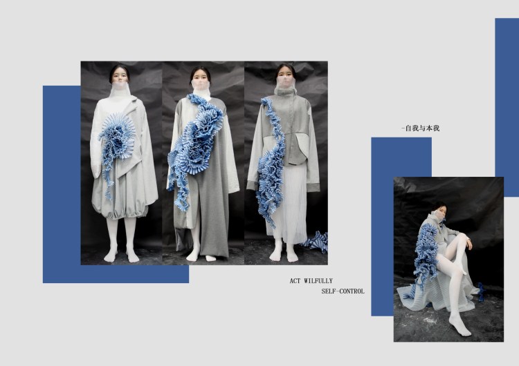 本次设计灵感来源于著作《自我与本我》。通过两种质感不同的面料、不同的造型设计手法来表现自我与本我两种不同的状态。本系列以灰白为主色调,将白色纱质面料经过蓝色压压褶工艺处理后再经过扭转、堆叠设计出立体造型部分,再与平面造型进行融合,从而进行虚实的对比,繁简的对比,厚薄的对比,赋予设计感。