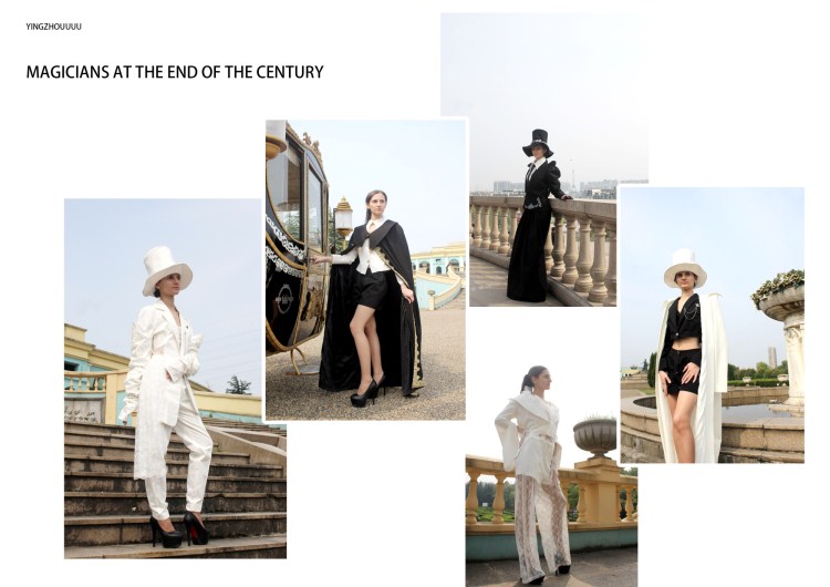 本系列主要色彩黑白,金银色加以点缀,以怪盗基德和魔术师这一职业为灵感打造华丽优雅神秘的中性风女西装,参考西装的构成特点,对传统进行颠覆,将普通西服元素打散重组让服装有崭新的视觉感受,通过局部刺绣和绣花拼接等工艺方式来呈现西装的精美度和独特性。