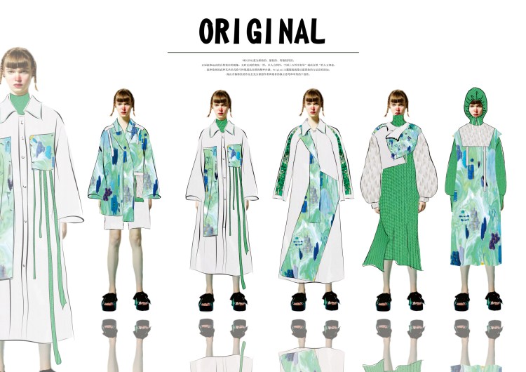 ORIGINAL意为原始的、最初的、有独创性的。正如流体运动的自然效应的现象,无时无刻的变化一样,非人力所控。中国上古哲学倡导”道法自然“的人文理念,流体绘画的此种艺术形式恰巧体现道法自然的精神内涵。Original主题服装就是以最原始的方法没有添加,做出有独特性的作品且充分保留作者和观者的独立思考和审美的个别性。此次ORIGINAL设计主题通过流体、钉珠和袖坠这些原始的手工艺来体现。