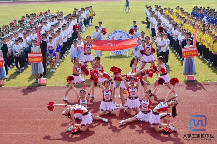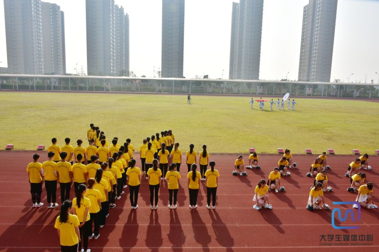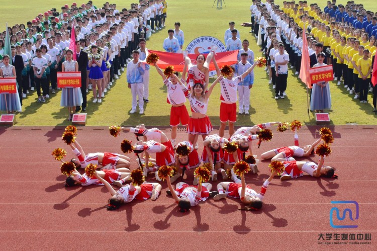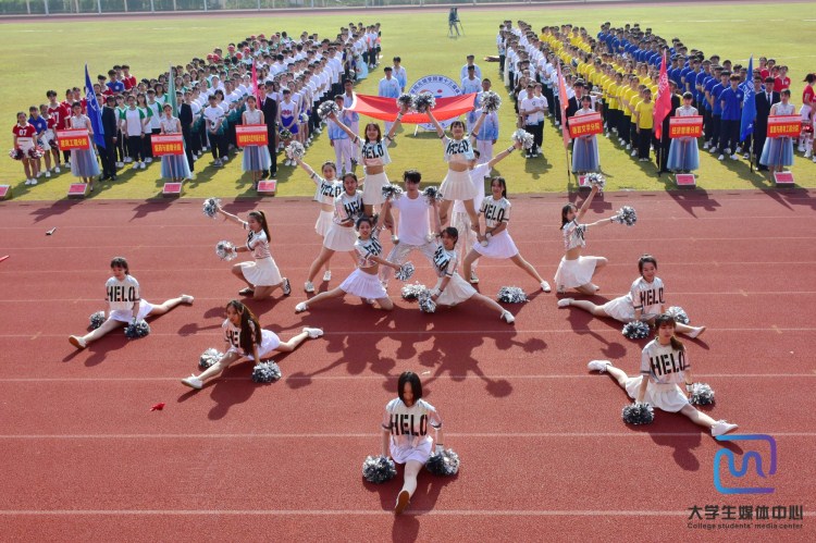 裁判员代表谢军老师和运动员代表语言文学分院翻译1602班唐露芬同学先后上台宣誓。在全体师生的满怀期待与热烈欢呼中,健美操表演比赛精彩上演。各分院队员们身着具有青春气息的啦啦队服,挥舞着颜色各异的闪耀手花,伴随富有节奏感的音乐舞动身姿,在蓝天白云之下向大家展示了“健康美丽,和谐统一”的青春活力和“以体健身,以操育德”的动感激情。
