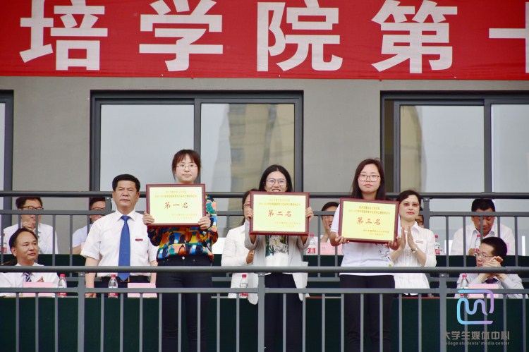 叶访春、李黎、沈玮为学生组团体总分前三名颁奖,经济管理分院、建筑工程分院、纺织服装与艺术设计分院代表上台领奖