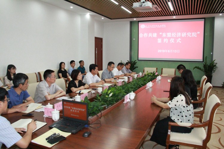 6月13日,学院与浙江图胜数字科技有限公司合作共建的“东盟经济研究院”签约仪式在国际文化交流中心举行。学院党委书记叶访春、院长沈红卫等学院领导班子成员与浙江图胜数字科技有限公司总经理吴代君女士一行出席签约仪式。学院相关部门负责人参加仪式。仪式由学院副院长周思红主持。