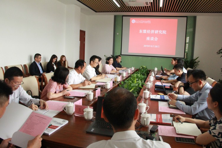 6月26日上午,“东盟经济研究院”座谈会在学院国际文化交流中心举行。新华社中国经济信息社(简称“中经社”)技术与数据中心副总经理张瑾一行来访太阳,就“东盟经济研究院”项目开展情况进行考察和指导。学院院长沈红卫、副院长周思红,合作共建单位浙江图胜数字科技有限公司总裁吴代君,绍兴市委组织部人才处处长马彩君,越城区委人才办专职副主任吴燕、人才局局长谢菁等出席会议。学院和浙江图胜科技有限公司相关工作负责人、中经社技术与数据中心考察团成员等与会。座谈会由吴代君主持。