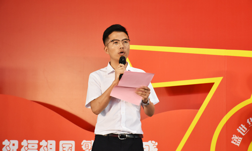 仪式开始前,全场肃立,为庆祝新中国成立70周年共唱国歌。在庄严的国歌仪式后,学院07级工商管理专业优秀毕业生杨家欢代表留绍学子上台发言。他表示绍兴的环境好、平台好、政策好,是自己当初选择留在绍兴发展的最重要原因。这几年,随着拥抱大湾区、融入长三角一体化进程的加快和人才新政的出台,绍兴的区位、政策优势更加明显。因此他呼吁更多的优秀学子能选择绍兴,留在绍兴。