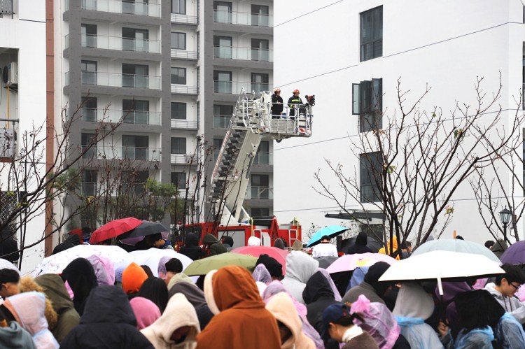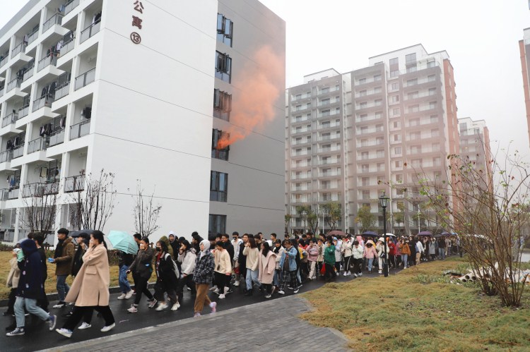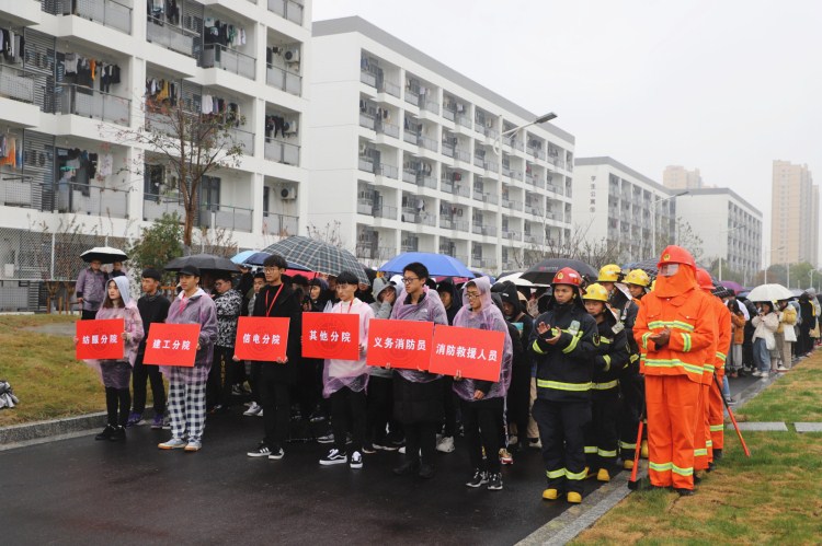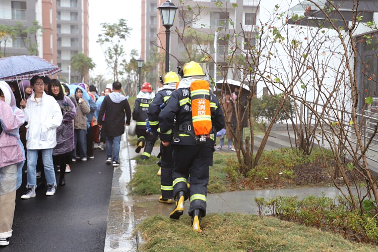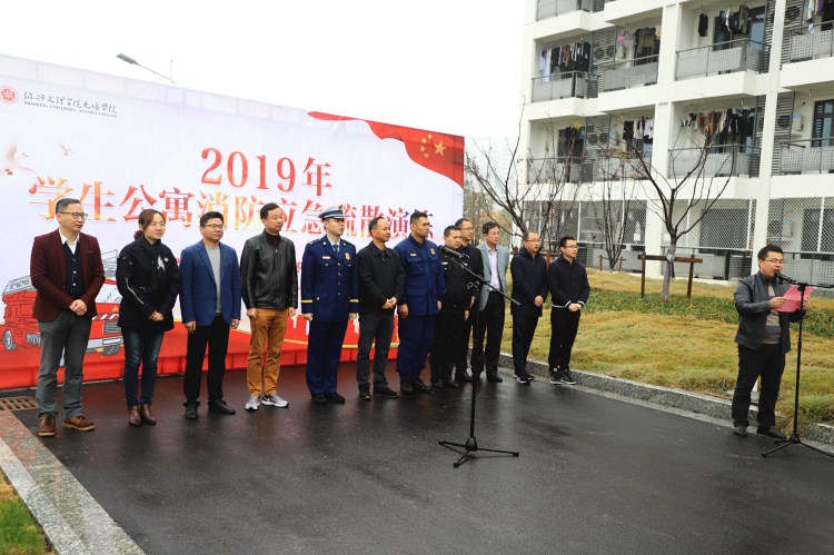 为认真贯彻落实“119”消防宣传月工作,遵守消防安全管理有关法律法规,进一步强化师生员工消防意识,提高预防自救能力,营造安全稳定的校园环境。11月27日中午,学院2019学生公寓应急疏散演习在北区学生公寓12、13幢举行。学院党委副书记石旭明、绍兴市消防救援支队越城救援大队参谋王深忱、特勤中队指导员寿伟、绍兴市公安局越城分局东浦派出所副所长陈诚出席活动。各分院书记(副书记)、学生辅导员、消防救援官兵、辖区民警、义务消防员及学生代表等800余人参加活动。演习活动由保卫处副处长陈永东主持。