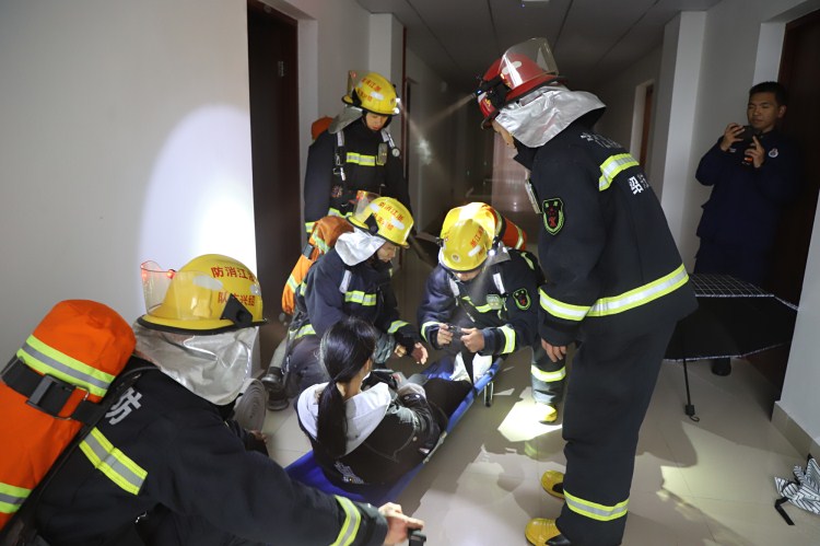 12时30分,演练总指挥石旭明宣布演习开始。随着学生公寓弥漫的烟雾,消防疏散信号的拉响,公寓楼内各楼层在疏散引导小组人员的指挥与引导下,用湿毛巾捂住口鼻,弯腰、快速从楼梯有序向楼下撤离。随后学院微型消防站消防员、警务室救援队、医务室120急救车、消防救援车根据预定时间陆续到达救援现场,迅速进入公寓对火灾与人员进行救援、疏散。现场还对伤员担架救援、登高云梯救援等项目进行实战演练,最终全部学生均顺利撤离至安全区域。整个应急演练活动安全有序、规范高效,现场没有发生一例奔跑跌倒、拥挤踩踏等事故,达到了演练的预期目标。
