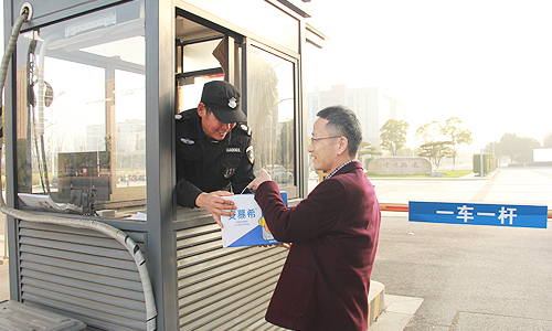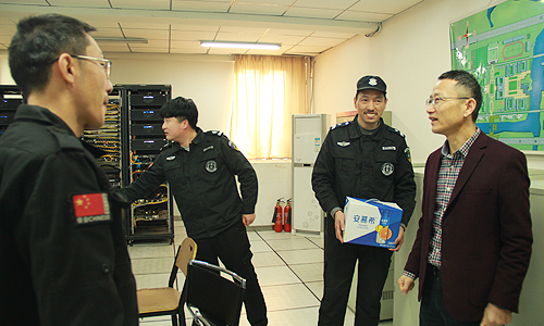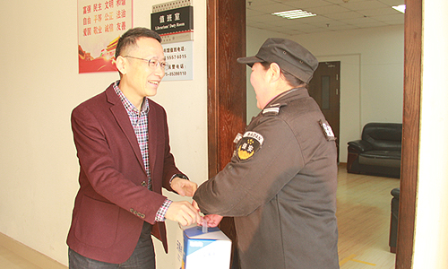 沈红卫一行先后来到图书馆一楼门卫室、西大门门岗及派出所警务室、南区高配房、学生公寓值班室、大学生活动中心监控室等,亲切慰问了寒假期间依然坚守岗位的教职工,致以诚挚的问候并代表学院党委和行政送上了新春祝福和慰问品。