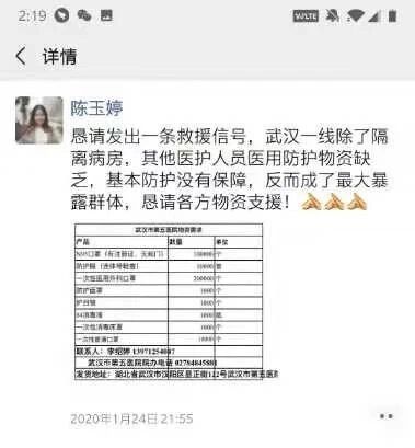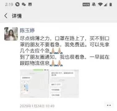 “了解追踪物资物流信息,呼吁朋友圈内共同救援,实时更新口罩等捐助信息和武汉协和医院紧缺物资情况,这是我每天都在做的事。”陈玉婷说,“但是在购买口罩期间,我也经历了一些小波折:大年初一,我收到了假口罩19000个,大年初七,我又买到假口罩3600个,损失不少钱不说,不良商家欺骗消费者的行为令人气愤。后续,我还将着重处理解决假口罩问题,同时继续呼吁救援,发动募捐,支援各家各户、支援武汉、支援社会,为疫情防控贡献自己的力量。”