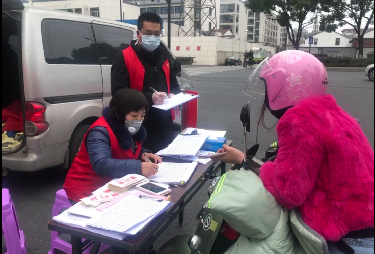 2月3日下午,绍兴市胜利西路上的快阁苑防疫卡点,严兴尧和社区志愿者们筑守在离家最近的疫情防线,正忙着询问登记。