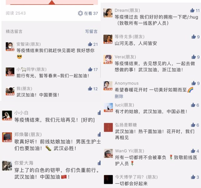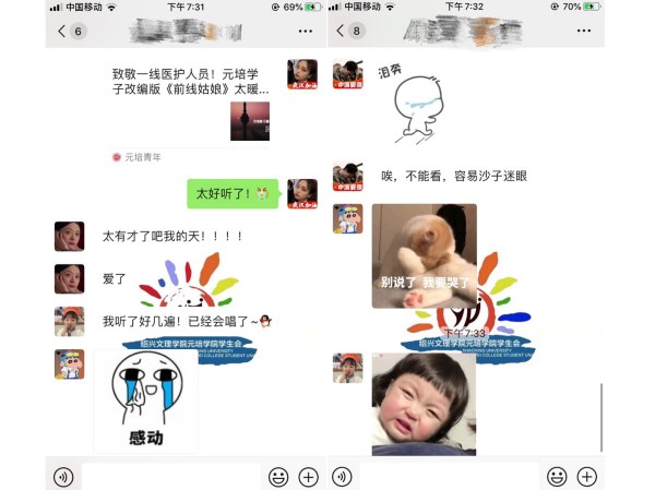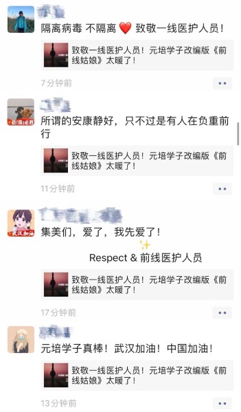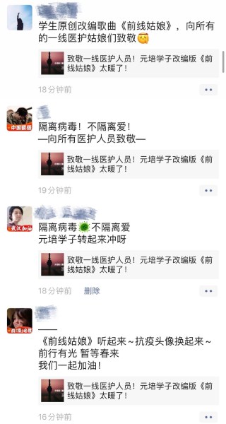 “疫情下,医院病房,是前线的姑娘,你身披着白色的盔甲,你双手已受伤……”近日,一首歌曲《前线姑娘》在太阳成集团tyc9728师生朋友圈间广为流传,该歌曲由太阳成集团tyc9728学生江伶俐将歌曲《桥边姑娘》进行歌词改编,用歌声声援正在防疫一线奋战的巾帼战士们。歌曲一经发出,学院师生便纷纷转发推荐,大家纷纷表示“歌词深入人心,朗朗上口,歌曲温暖有爱,满满正能量,已经都会唱了”。不少师生更是用“想哭”、“感动”和“泪目”、“加油”的表情包,表达着内心的感受。