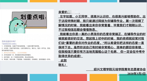 为助力绍企,学院青协开展“一堂微网课”授课活动,通过线上结对数十名外地市企业职工子女,并对他们进行课程前的问卷调查,在了解到孩子们在学习中需要得到的帮助与学习目标等相关信息后,便紧锣密鼓地开始了线上教学筹备。课程除了为孩子们上一堂防疫宣传课外,还对他们的学业进行辅导。从小学到高中,帮扶的孩子们涵盖了各个年级、各个学科,在短短的一星期内,志愿者们以高度的热情和认真的态度为每一堂课程辅导做足了准备。志愿者杨舒静表示,“虽然时间紧凑,但我们会努力做到最好。”