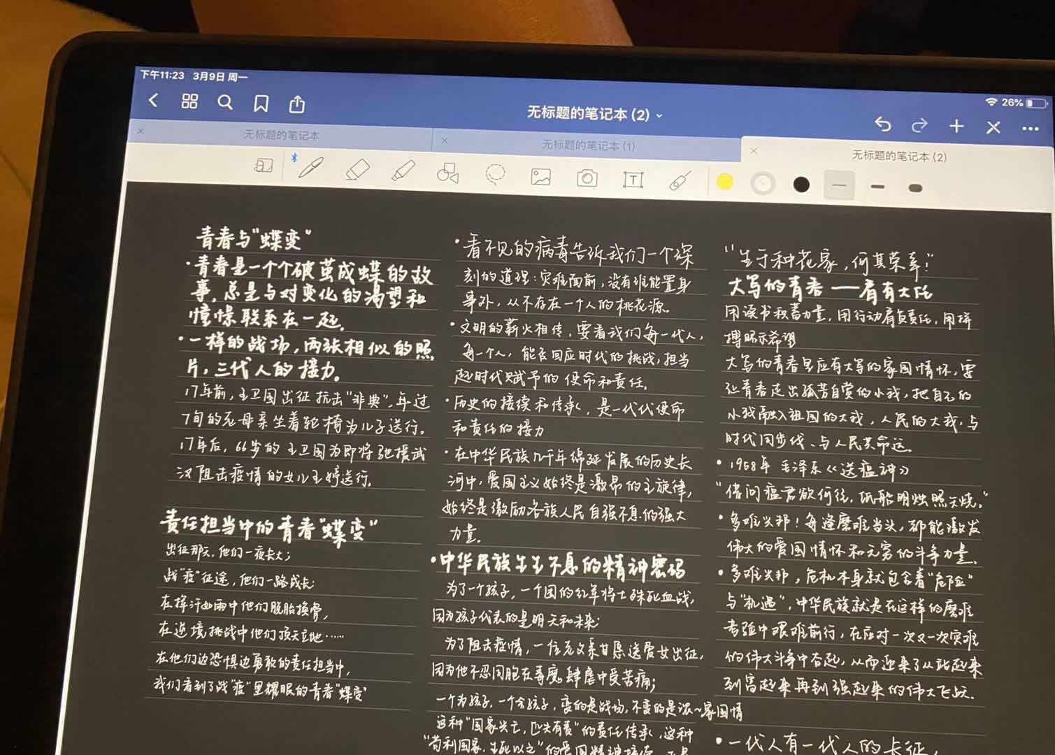 战“疫”里“破茧成蝶”的青春是年轻的医护人员始终坚守不离的信念,是“曾经是你,今天是我”的那份沉甸甸的担当。汉语言1801班钟佳苗说,中国青年精神展现在90后,00后成为驰援湖北医护人员的主力军,展现在全国一支支“青年突击队”的快速行动,展现在青年人在城市的各个角落为防疫做着力所能及的事情,这也充分展现了青年一代的爱国情怀,在奋斗、担当中谱写青春,担当历史使命和时代责任。