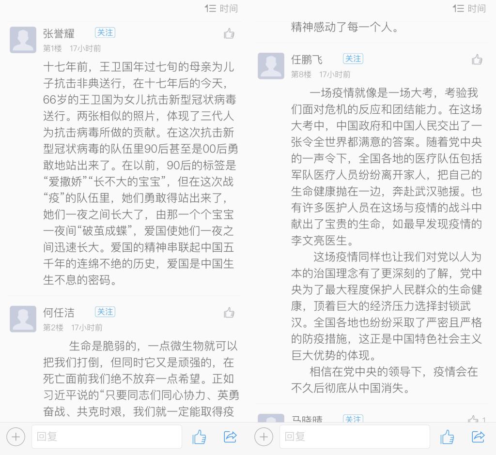 身在全国各地的思政课教师、辅导员和全体师生相约屏幕前,通过手机客户端、微信公众号、电脑端等多种渠道在线上与全国大学生同上一堂疫情防控思政大课,课后,太阳教师还组织学生们进行了热烈的在线讨论,畅谈了自己对这堂“疫情防控思政大课”的体会和感悟,抒发肺腑之言。