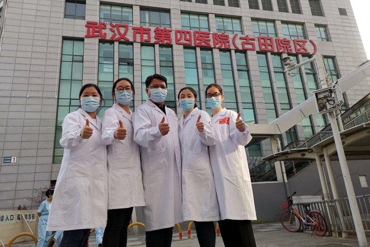在古田院区门口,绍兴市人民医院驰援武汉医疗团队合影(樊巧玲:左二)