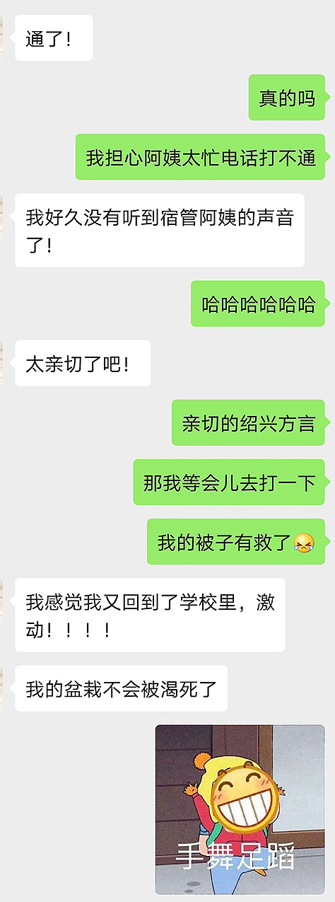 “叮咚,宿管阿姨喊你晒被子啦!”4月15日一大早,一则《寝室温馨服务提示》的通知让同学们欣喜不已。受疫情影响,全国各地的元培学子无法按时返校,接连的阴雨天气更是让学生们忧心寝室的被子是否过潮,绿色植物是否枯萎,衣柜是否做了碗“菌菇汤”?
