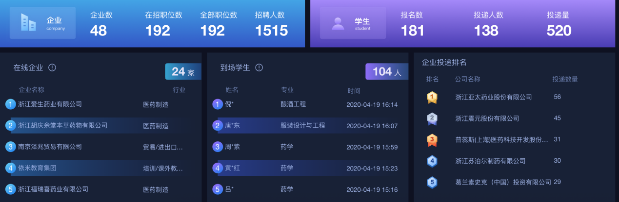 本次空中双选”招聘会汇集了辉瑞制药、雅培制药、江苏恒瑞、浙江震元等近50家国内外知名医药类企业报名参会,提供医药QC/QA、OTC市场部助理、药物制剂研究员等类别的职位192个,就业岗位数总计超1500个,共有181位校内外学生参与应聘,共投递简历520份,其中医药与健康分院156毕业生全员参与本次双选会。