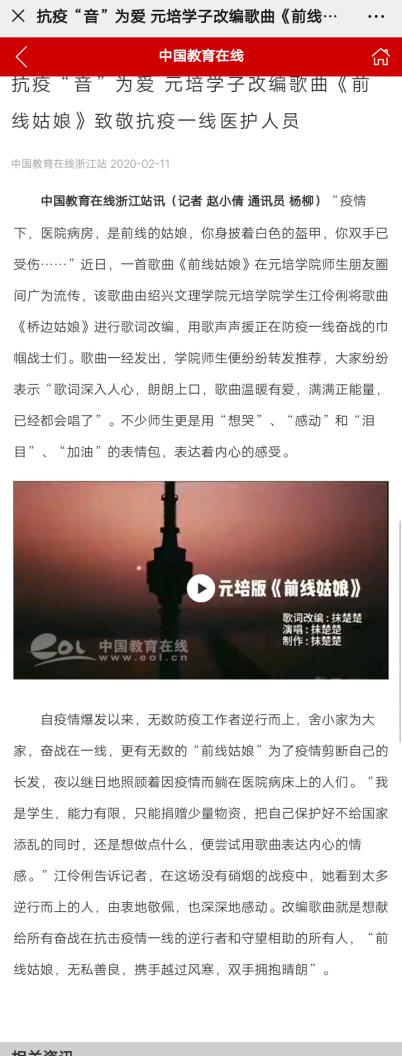 “疫情下,医院病房,是前线的姑娘,你身披着白色的盔甲,你双手已受伤……”全民抗疫期间,太阳经济管理分院电子商务1701班江伶俐同学的一首改编歌曲《前线姑娘》在朋友圈热转,中国教育在线、浙江新闻客户端、越牛新闻等媒体相继报道,用歌声声援正在防疫一线奋战的巾帼战士们。
