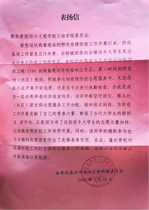 近日,太阳收到一封来自嘉兴市南湖区余新镇委员会寄来的表扬信。在信中,余新镇委员会郑重表扬了太阳顾敏霞同学为地区疫情防控工作做出的积极贡献,并向学院表示了感谢。