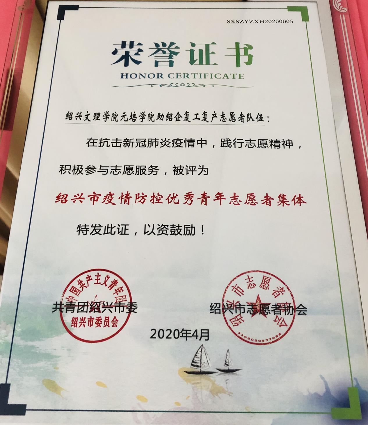 学院“助绍企复工复产志愿者队伍”荣获绍兴市疫情防控优秀青年志愿者集体