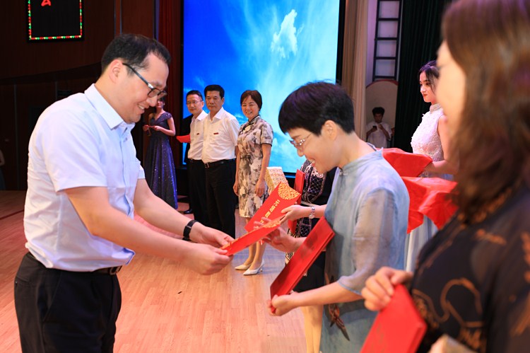 周琦为三位获奖教师颁发奖金红包
