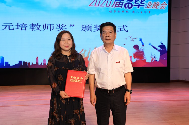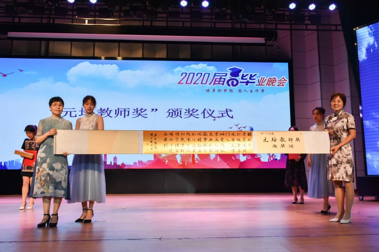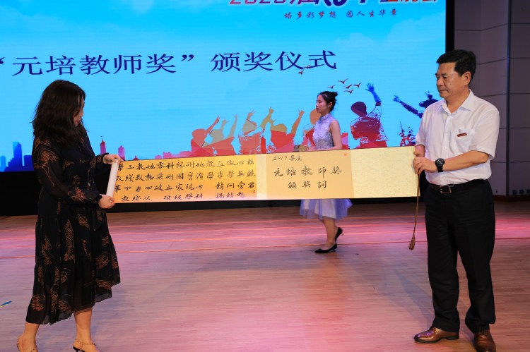 晚会上,学院教师最高奖“元培教师奖”颁奖仪式举行。学院副院长李黎宣读表彰文件。郝敬习、叶访春、沈红卫分别为获奖者纺织服装与艺术设计分院楼利琴老师、医药与健康分院杜轶君老师、经济管理分院蒋江林老师颁发颁奖词书法卷轴和荣誉证书。金汉强为三位获奖教师颁发奖金红包。石生元为三位获奖教师献花。