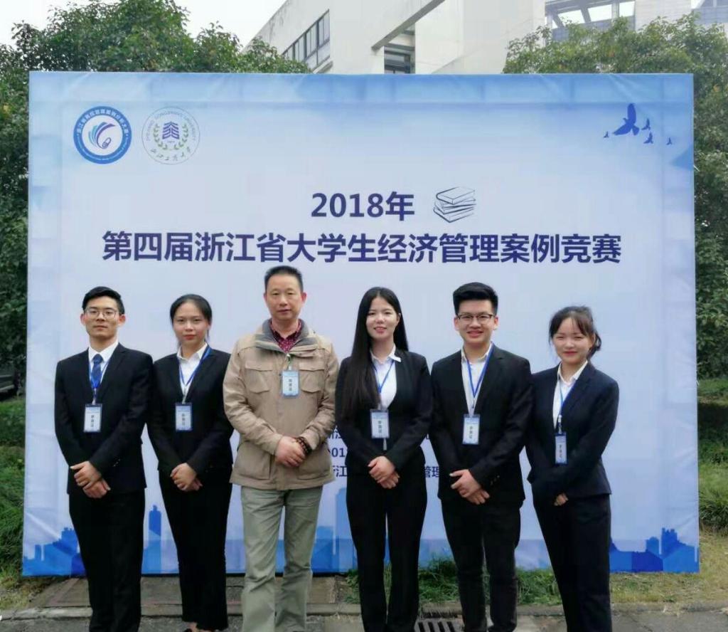 2018年第四届浙江省大学生经济管理案例竞赛获省二等奖。团队成员(左起):黄成伟、范佳敏、顾诗燕、梁 睿、郭顺良