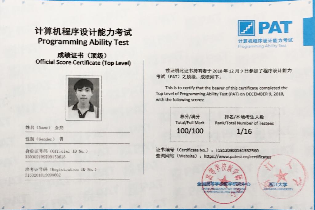 鼓励学生参加PAT考证,PAT为企业选拔人才提供参考标准,为考证学生获得企业敲门砖。多人在PAT乙级中满分,其中学生金亮在2018年冬季考试中只用1个小时(3小时考试时间)获得了顶级(乙级中文题、甲级与顶级都是英文题)满分的好成绩。