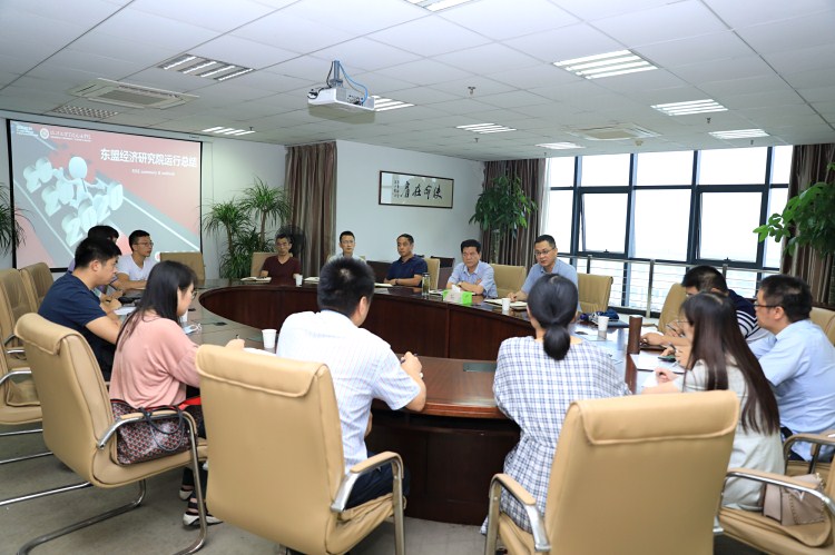 7月15日上午,东盟经济研究院成果汇报及工作推进会在图书馆813会议室举行。党委书记叶访春、院长沈红卫、副院长周思红出席汇报会。东盟经济研究院院长李文龙做专题汇报。科研处负责人、经济管理分院教师代表等有关人员与会。