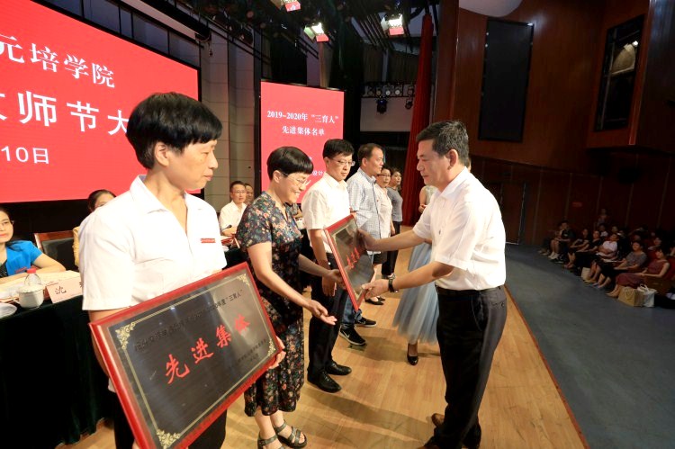 沈红卫向叶访春、宣仕钱、杨文兵三位教龄满30年的教师献花。叶访春为2019-2020年度学院“三育人”先进集体医药与健康分院、纺织服装与艺术设计分院和王学炎等4位学院“三育人”先进个人颁发奖牌和证书。大会表彰了李睿等5位获得学院第九届教学优秀奖一等奖教师、章霞等14位获得学院第九届教学优秀奖二等奖教师、王春燕等30位优秀班主任代表、冯融融等8位优秀辅导员、经济管理分院等2个2019年毕业生创就业工作先进集体、董银妍等10个学院就业创业工作先进个人、宣页沁等10个学院就业创业工作贡献奖获得者、牛路等10个学院毕业生就业回访调查优秀奖获得者。
