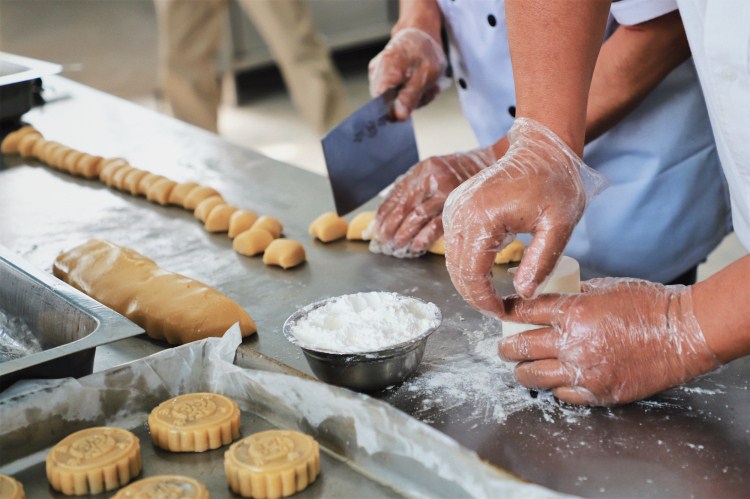 后厨的桌子上,与糖浆混合揉好的面团,经过一两个小时的醒发,变得金黄柔软。学院兴越楼餐厅的师傅接过面团,揉成长条,切成一块一块大小匀称的小剂子。拿起一块剂子,阿姨灵巧的双手往面团中间一按,四指来回捏动边缘,一只小碗形状的饼皮出现了。“碗”里要装的,当然是提前准备好分成小块的月饼馅儿了。裹好馅的饼皮在阿姨手上滚动一圈,成了一只圆球。一个个裹好馅的面团相继过模具,一只只成型的月饼跃然眼前。