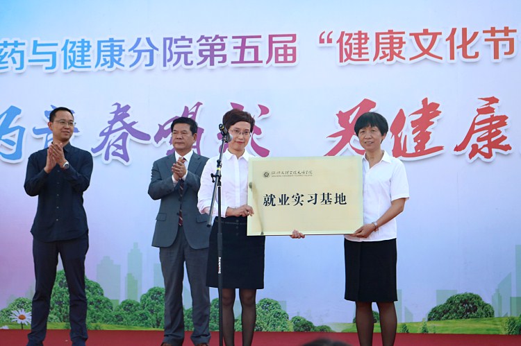 绍兴市人民医院护理部主任马红丽(右二)授予学院就业实业基地牌,分院负责人(右一)接牌