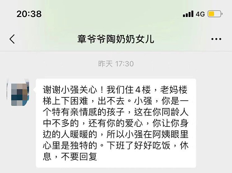 因为个子小的缘故,爷爷奶奶们总喜欢把黄慧强看作小朋友、小孙女,还亲切的唤她:“我们家小朋友”,她也有事没事就喜欢跟老人们聊天:“吃饭了吗,今天吃的什么呀?”还会跟他们撒娇:“我还没下班,现在好饿呀。”她像只小蜜蜂一样忙个不停,快乐也感染到身边其他人。病房里有一位奶奶八十多了,四月份的时候查出癌症,日夜守护在病床边的她的女儿,不曾想也被检查出身体问题,“我能感受到阿姨的内心很痛苦,天天都很忧愁。”黄慧强格外关心着这位阿姨的身体和精神状况,耐心听她倾诉,平常不见面的时候也会在微信上和她拉拉家常,看见今天天气好,便嘱咐她带着奶奶出去晒晒太阳。在她的陪伴下,那位家属一天天乐观起来,她在跟黄慧强聊天时忍不住说:“小强,你是一个特别有亲情感的孩子,很感谢你这一年送给我的温暖,想到你我就是开心的。”