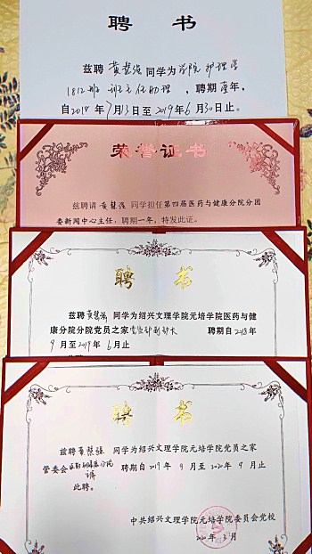 “锐意进取,无愧初心。”她刻苦学习,成绩优异:在校期间,她连续四年班级综合排名第一,多次获院一等奖学金及省政府奖学金,更在2020年荣获国家奖学金。她不忘初心,牢记使命:作为一名中共党员,她用实际行动充分发挥先锋模范作用,先后获得绍兴市暑期社会实践先进个人、“优秀党务工作者"等先进称号;她工作务实,能力突出:在担任医药分院党员之家主席期间,联合分院大学生党员依托专业优势,打造了绍兴市首支由医护类专业学生组成的“安宁疗护志愿队”,用以心换心的真情陪伴着疾病终末期患者,力所能及地给他们带去关怀与温暖。她亦团结着一批又一批年轻力量加入到“临终护理”的志愿服务中,给更多的患者带去“爱”,让“阳光”拂去病痛折磨的阴霾,四年来的种种荣誉都是对她的肯定。到底,何谓赤诚之心?正如她,一路不懈奋斗,披荆斩棘,实现着德艺双馨双重的目标。